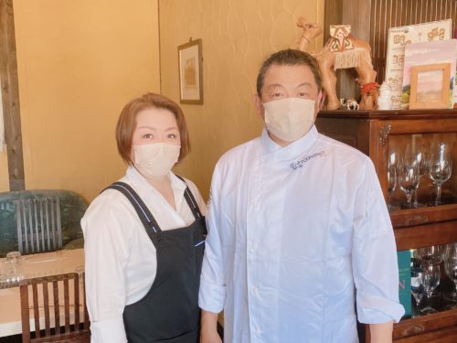オーナーシェフの有馬さんご夫婦。ご主人はフランスでフレンチを学び、地元の熊本で開業。この風景に魅了され16年前に南阿蘇でこのお店を始められたそう。
