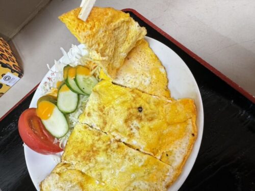 オムレツ形の玉子焼き。もしかしたら、なんか挟んであるとか?