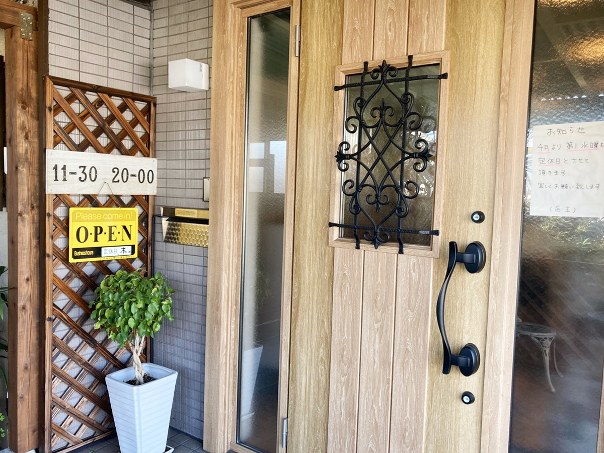 シンプルな外観と比べ、入口のドアはカントリー風のナチュラル可愛い感じ。