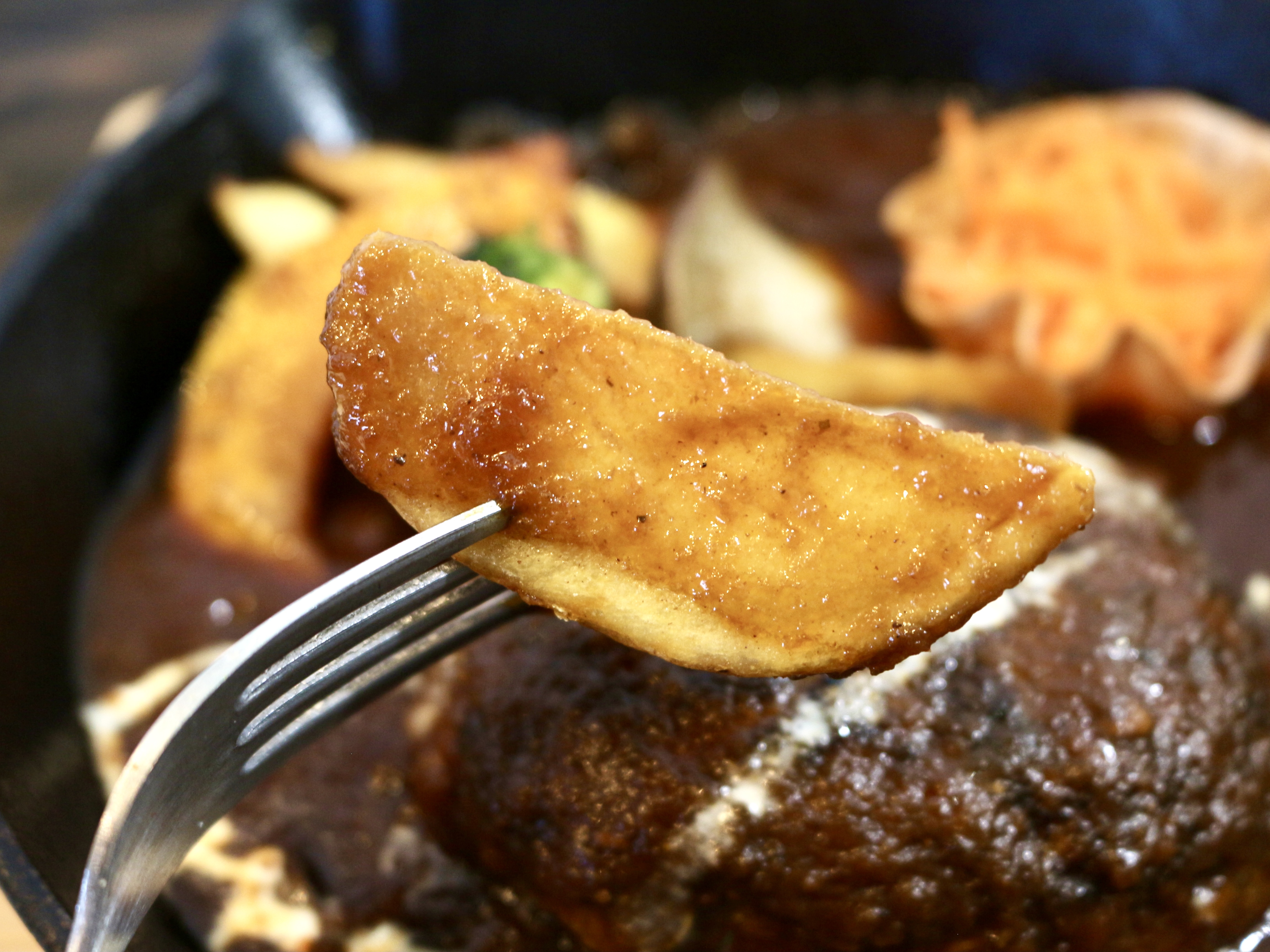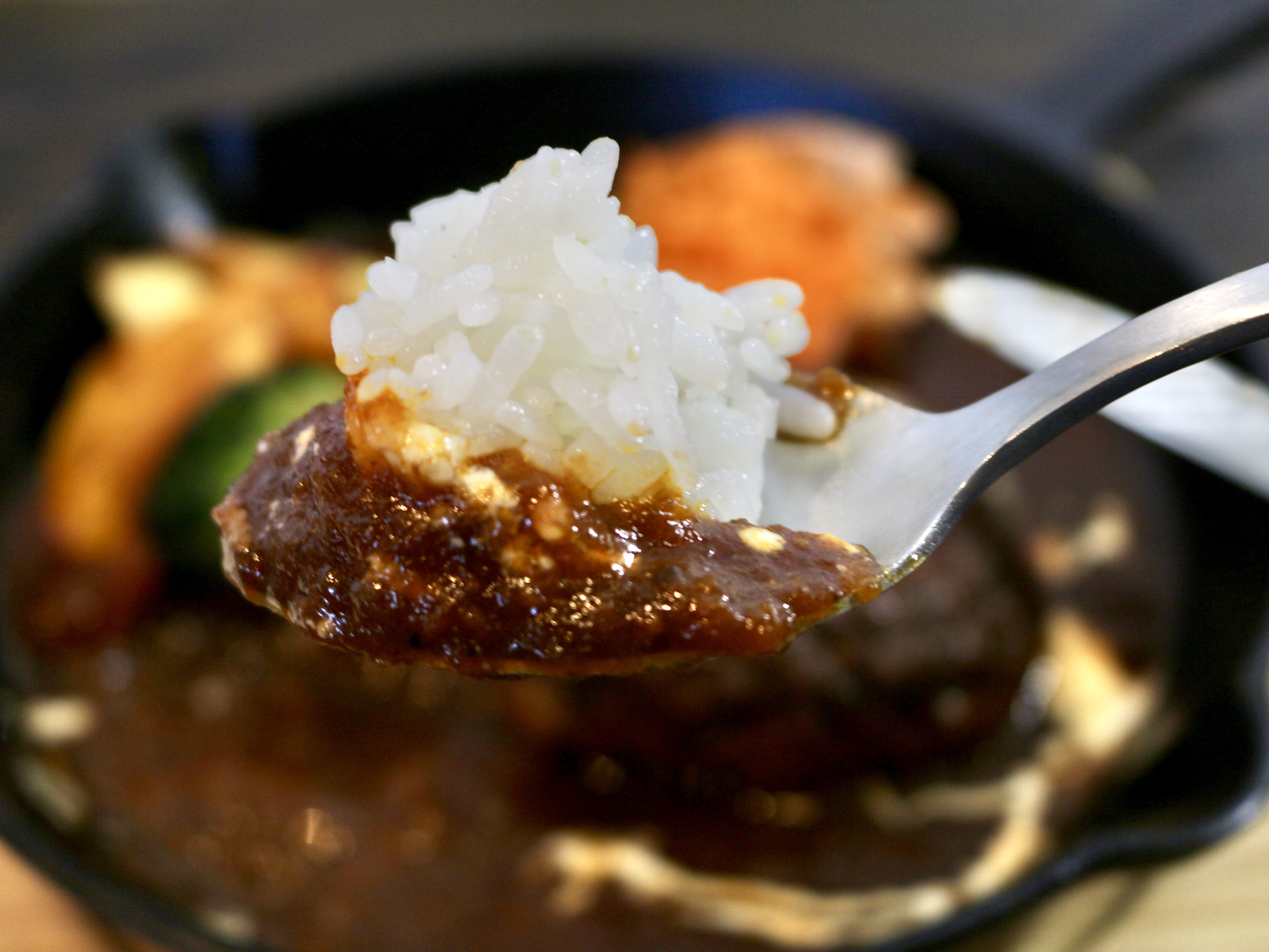 しかし、お店のおすすめの食べ方はご飯をこのデミグラスソースに付けて食べること。まるでハヤシライスみたいで相性抜群です。