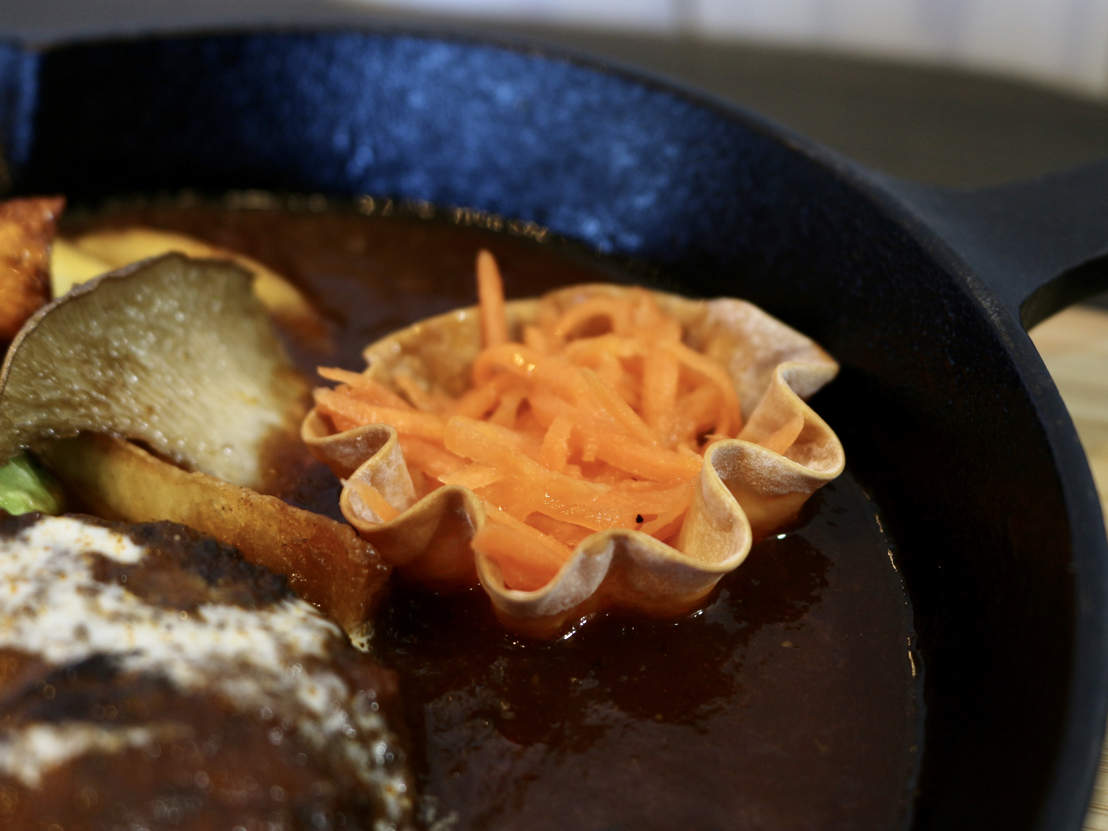 この煮込みハンバーグ、スキレット鍋にはなみなみと特製のデミグラスソースが注がれているんですが、これが人気の秘密!