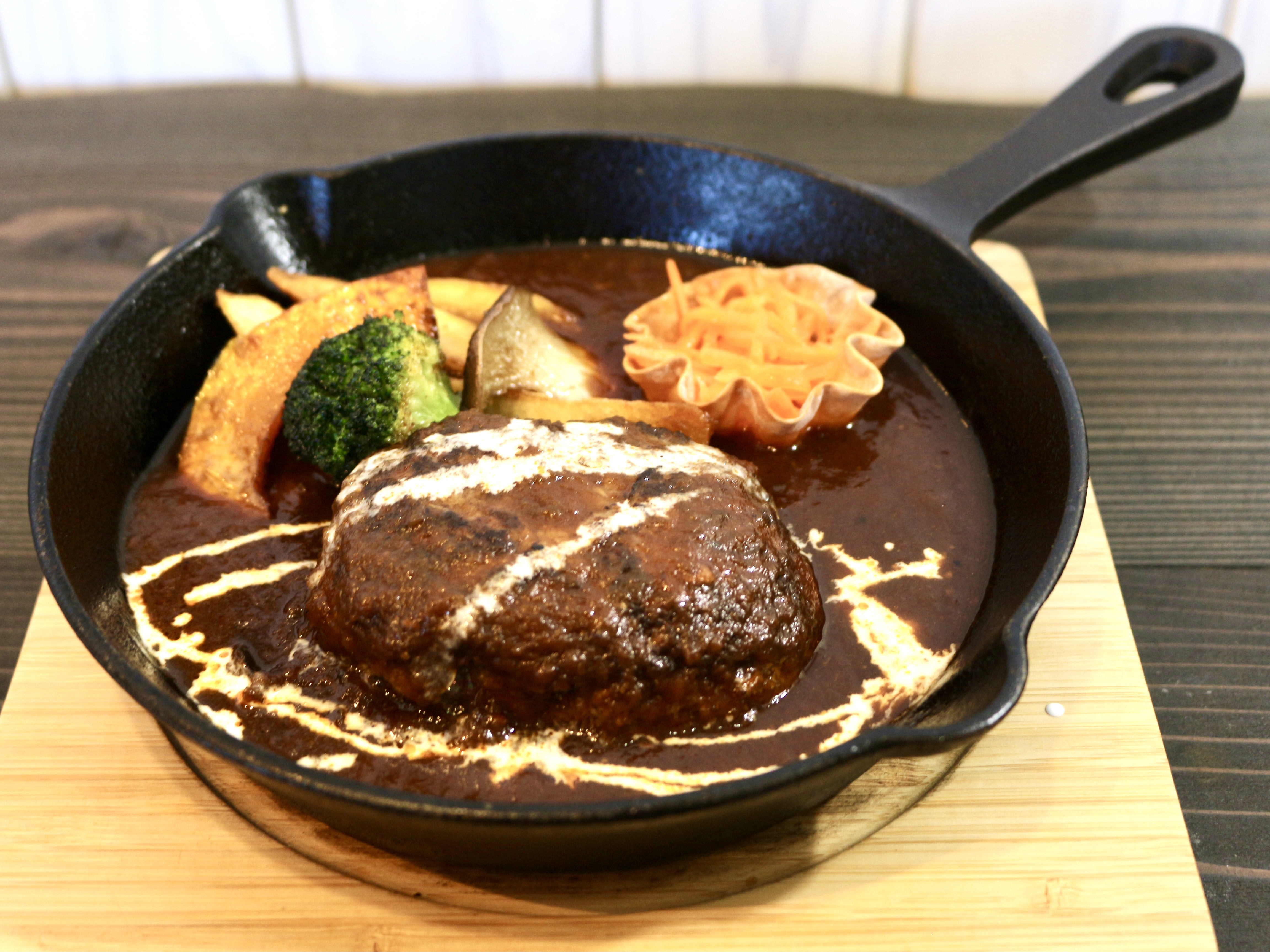 熱々のスキレット鍋にドカンと鎮座したハンバーグがやってきました。