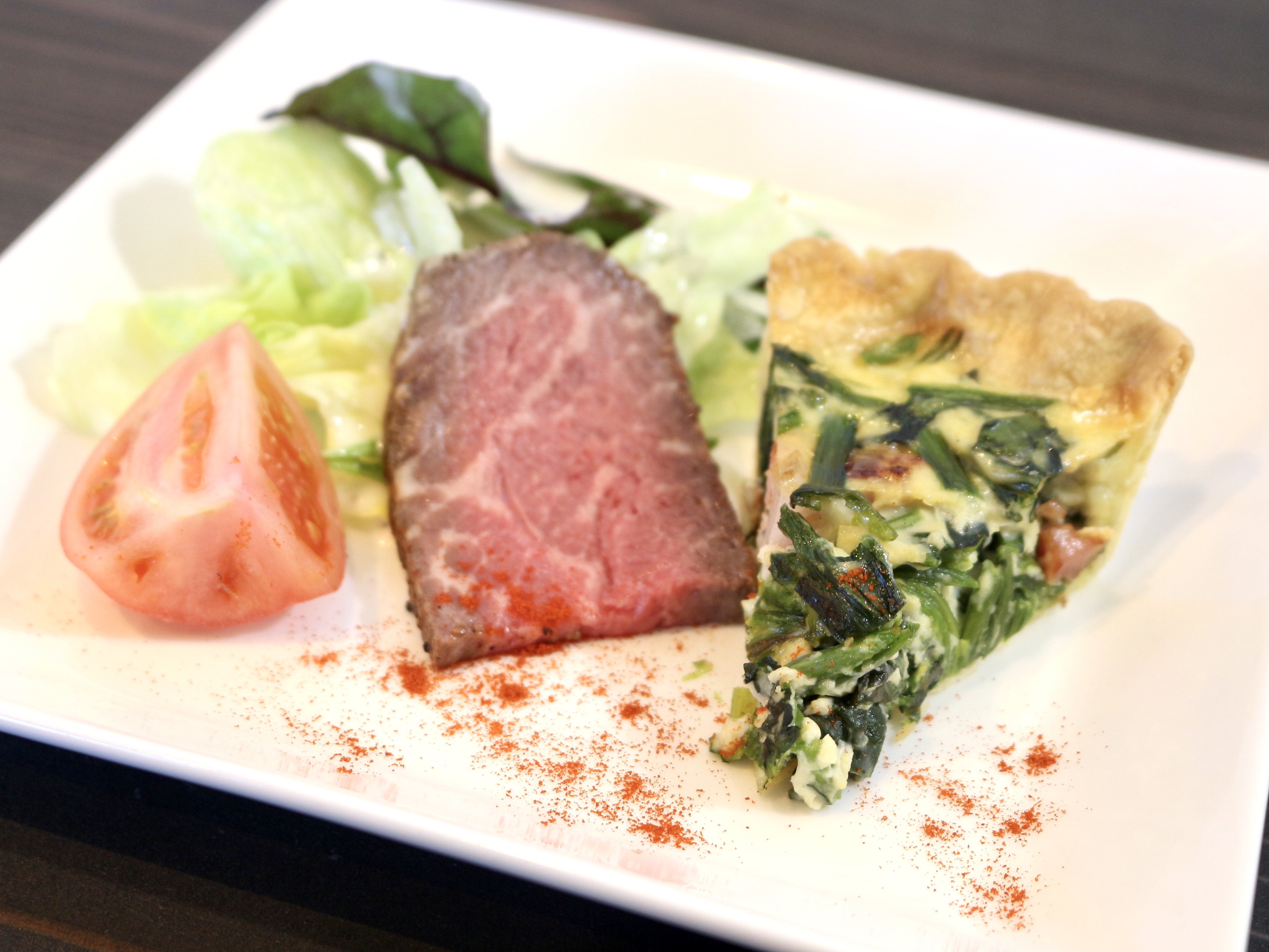 まずはセットの前菜盛り合わせ。サラダ、キッシュ、ローストビーフの3種盛りです。贅沢!