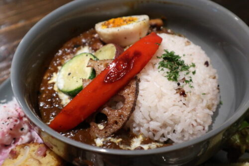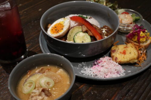そしてこちらがメインのカレー。トマト風味で辛さはなく、とろみが無くしっかり形のカレーで、食べ応え抜群。カレー麹を使ったカレーという事でお腹は一杯にはなるけれど、さっぱりとした食後で身体が軽いです。