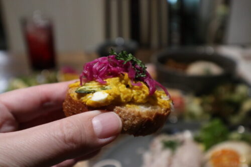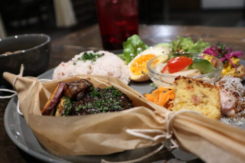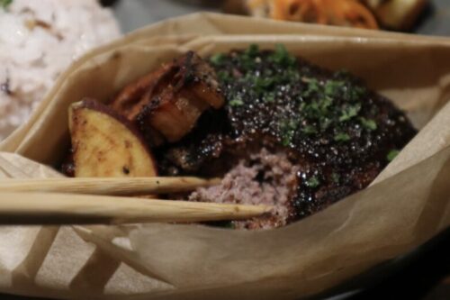 こちらのハンバーグは、タネに3種類の発酵調味料を使用されているそう。ソースは赤ワインと醤油麹をつかったデミグラスソースという事で味に深みがあって大人の味わい。ハンバーグには蓮根が練り込んであり、隅から隅まで身体がよろこぶレシピとなっております。