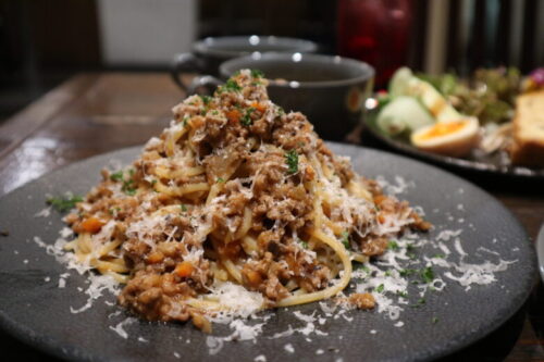 そして3つ目が「やみつきミートパスタ」(サラダ・ドリンク付き)。こんなに山盛りのパスタですが、勿論、