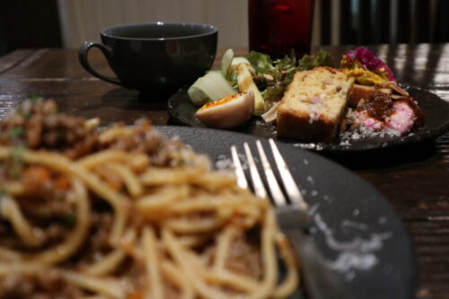 副菜のお皿も付いています。パスタをくるくる食べながら副菜もつまめる、ゆっくり贅沢なランチタイム。美腸麹は、腸内環境を整えるために非常に効果的な食材と言われておりますので、山盛りパスタに罪悪感なし!の一品です。