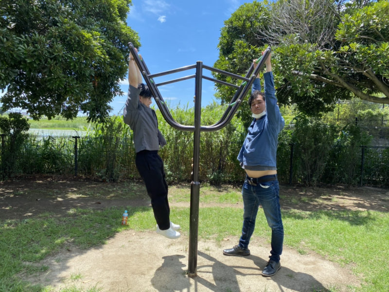 いやいや!!ずるしとるやん!一番上のバー握っても両足地面に付くとかどんだけでかいんですか!