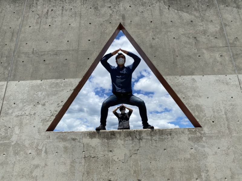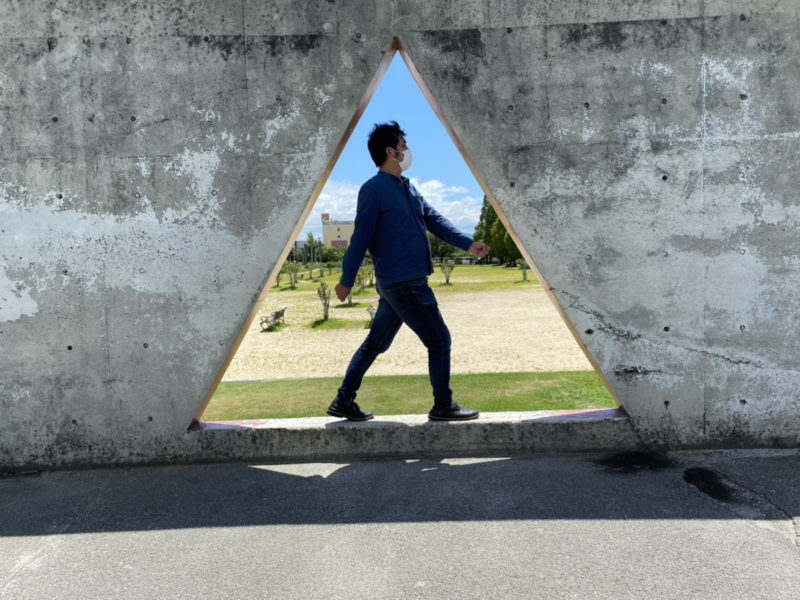こちらが謎の三角。ライター山田が標識ピクトグラムをしています。