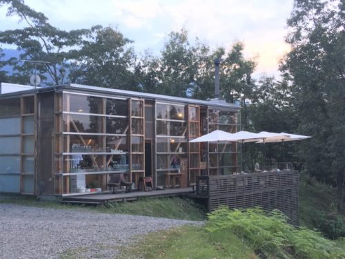 山都町の緑仙渓近くにある、全面ガラス張り設計のみずたまカフェ。