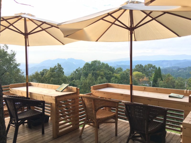 建物前のテラス席から臨む山々の景色は雄大で素晴らしく、遠く阿蘇五岳も眺められます。