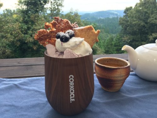 山都町の伝統保存食である焼き米が入ったガレットやクッキーがのった、山の都のごちそうパフェ(750円)は、ジェラートにいたるまで、すべてが手作り!