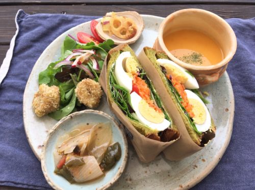 香り高い無農薬の矢部茶が練り込まれたパンで、地元野菜や卵をたっぷりはさんだサンドウィッチセット(1,600円)。