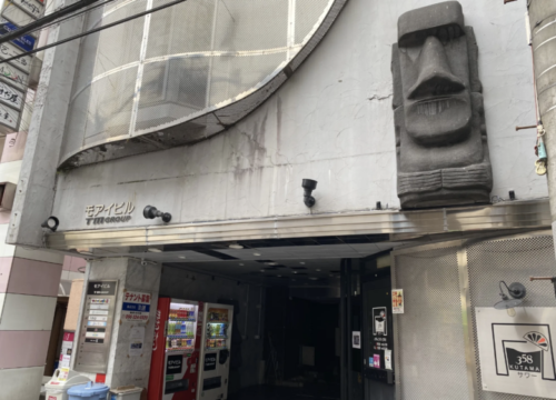 下通りから脇道に入った相撲通りのモアイ像(モアイビル)