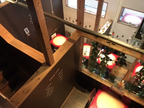 2階のお座敷席から下をのぞくと、1階が吹き抜けになっていて広々!店内は、空間を活かして様々な階層が設けられていたり、段差や仕切りを作って隣の人と目が合わないように作られているので、ゆったりとしたくつろぎの時間を得られそうです。