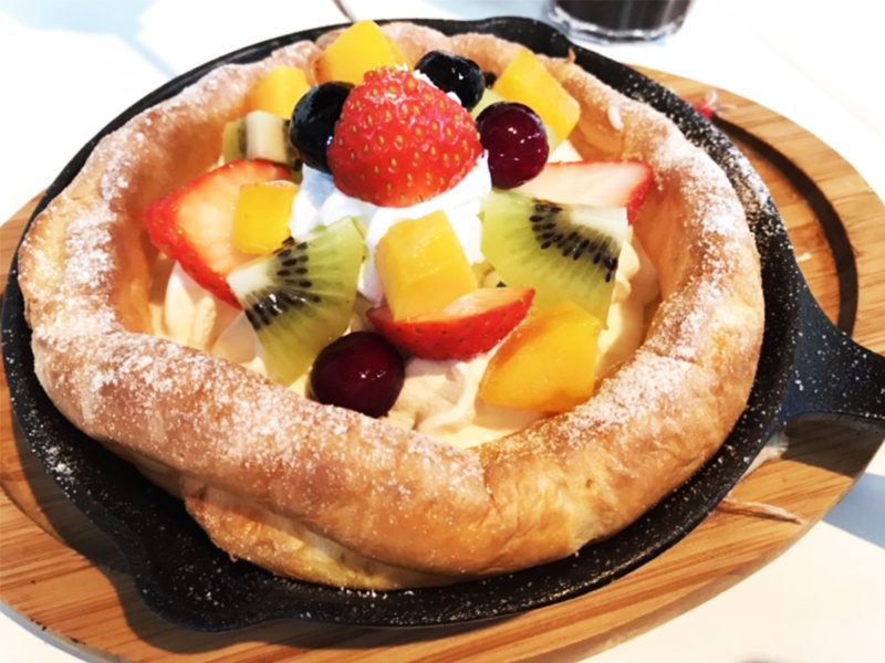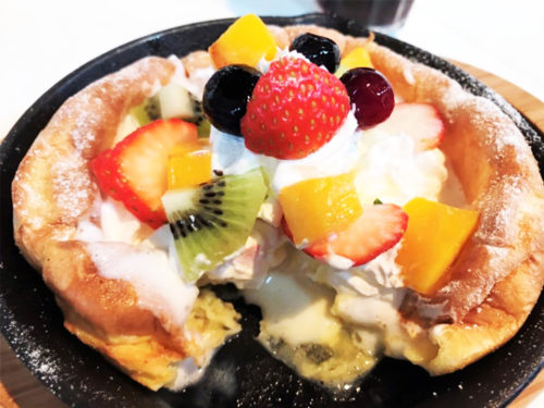 運ばれてきたダッチベイビーは、フルーツたっぷり!オーブンでじっくりと丁寧に焼き上げられた生地に、冷たいアイスと生クリームがのっていて、フルーツもたくさんトッピングされています。