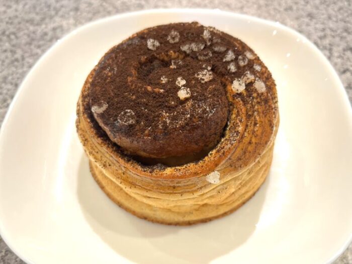 ロール状に巻かれたパンの上には、エスプレッソ用の珈琲粉末が掛かっています。