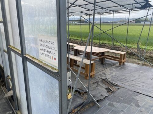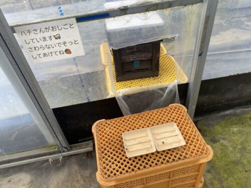 ハウス内ではみつばちが仕事をしています。大人しいので自分から触りに行かなければ刺されることはないので、見かけても騒がず慌てずそっとしておいてくださいね。