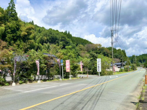 店は、菊池神社の方から熊本県道133号鯛生菊池線を竜門ダム方面へ行く途中にあります。