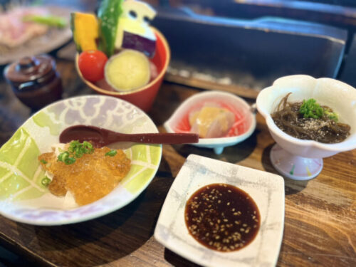 そして「八方ジュレのよせ豆腐」は、きめ細かくて柔らかいお豆腐の上に優しい旨みを感じるキラキラ輝くジュレがたっぷりと!器も一つ一つがすごくきれい!