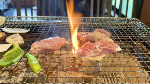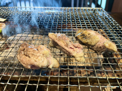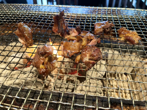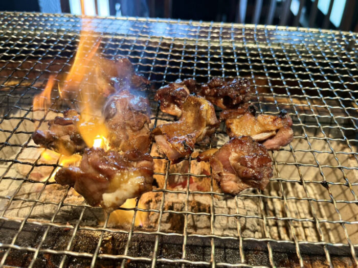 赤鶏と同様、皮目から焼いて両面に焦げ目をつけたら早めにハサミでカットして、網の上で転がしながらじっくりと焼いていってくださいね。