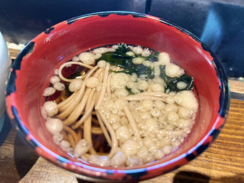 本日の汁物は「そば」。コシがあるそばと上品な出汁の味!アレルギーなども事前に聞いてくれるので、にゅう麺などに変更することも可能。