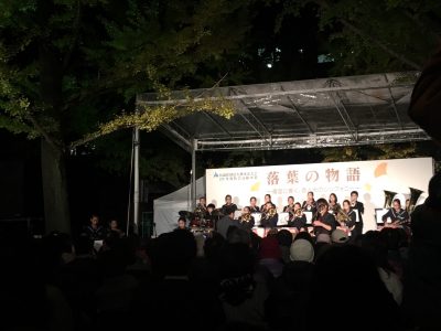 イチョウが見頃を迎えた18日の夜にはコンサートもあり、益城中学校吹奏楽部や、三味線奏者の高﨑裕士氏らの演奏に、訪れた多くの人々が酔いしれました。冷え込みも厳しい中でしたが、用意された700席のイスはほぼ埋まり、立ち見客も出るほどの大盛況のコンサートでした。