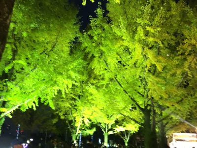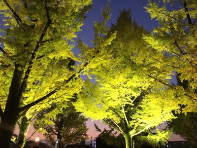 夕暮れ時、ライトアップされたイチョウも、思わず感嘆の声が漏れるほどの感動的な美しさです!