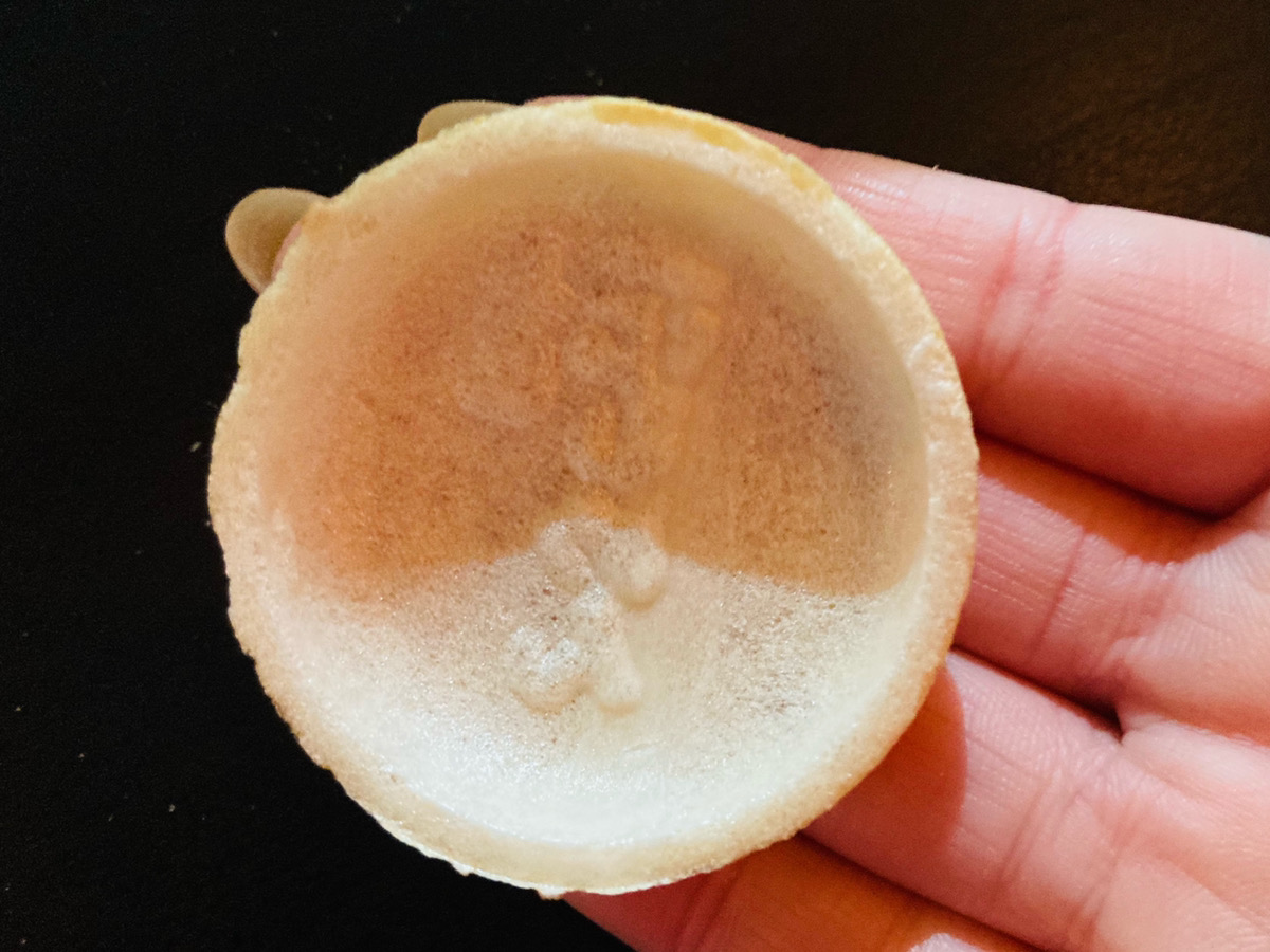 パリッパリの皮と柔らかい餡のコンビネーションがたまりません!初めて後で挟むタイプの最中を食べましたがこんなに美味しいって知りませんでした。皮の香ばしい香りをダイレクトに感じて、皮と餡の食感のギャップがまた面白い!うん、美味。