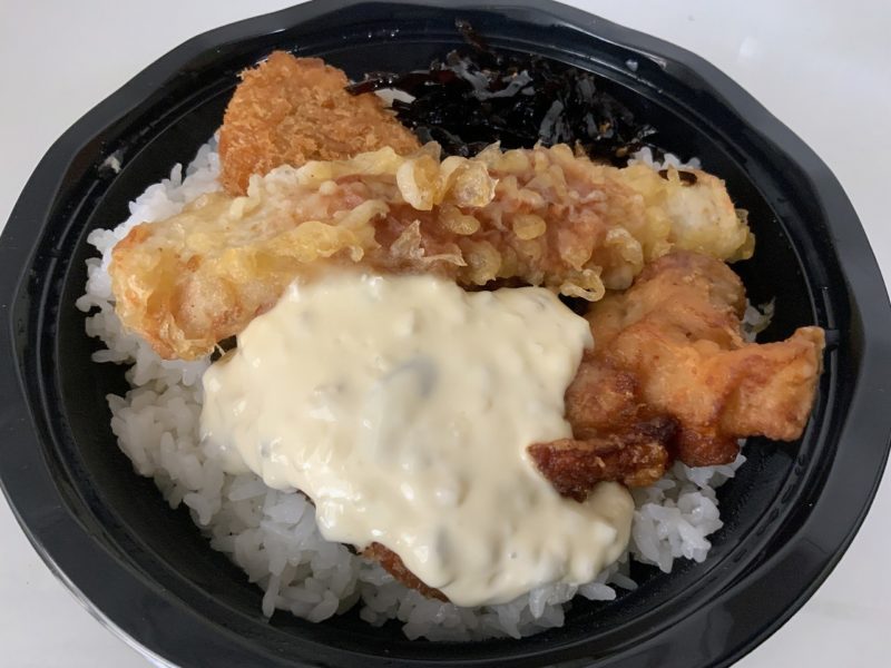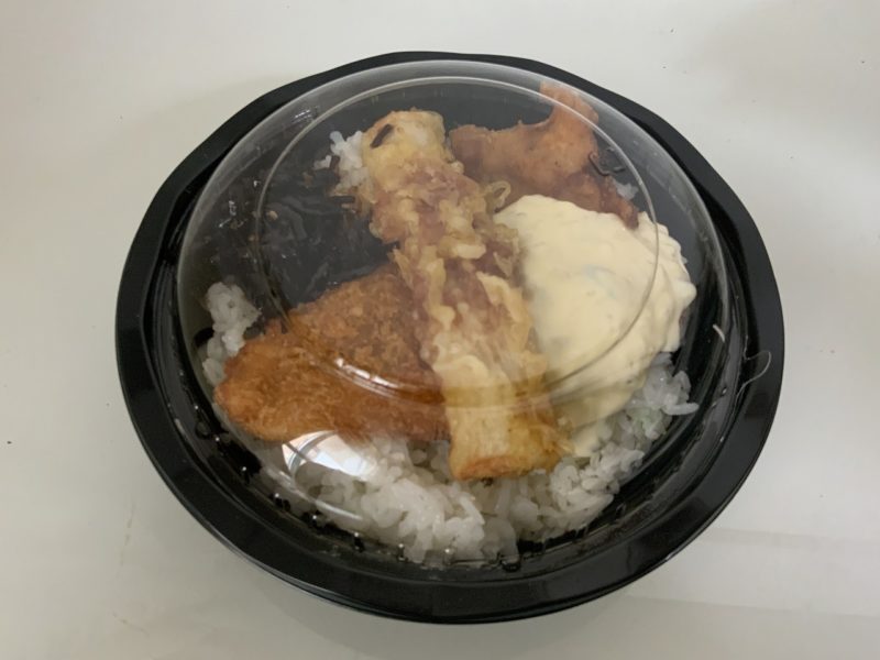 唐揚げ白身フライ、ちくわと乗って、タルタルソースがたっぷりかかっています。