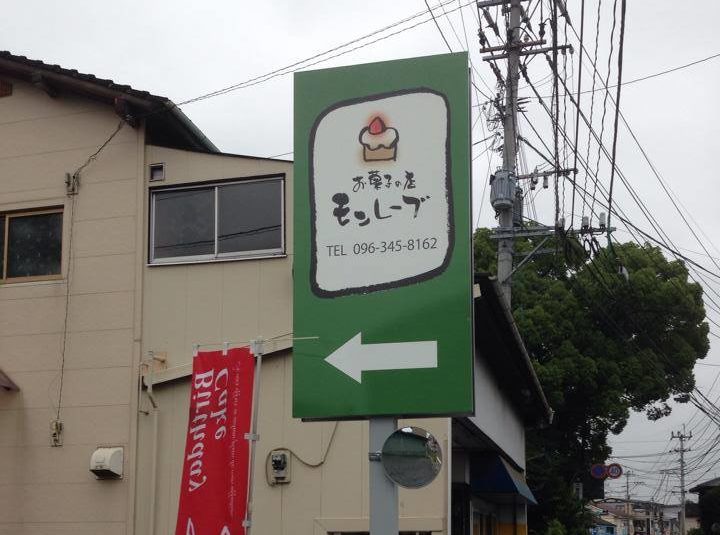 旧57号線(豊後街道)を熊大側から走ってくると、黒髪5丁目バス停より30mほど先に、「モンレーブ」の緑色の看板があります。