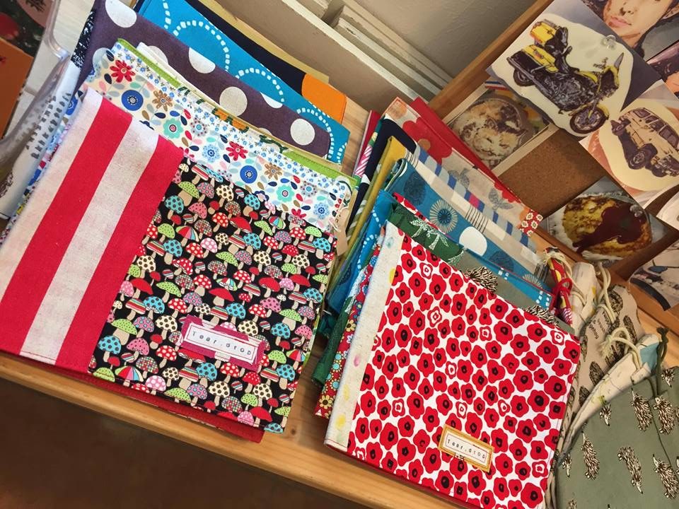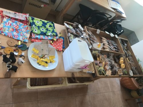 店内中央には、焼き菓子と雑貨が販売されています。県内の作家さんが作ったバッグやアクセサリーがたくさん並んでいます。