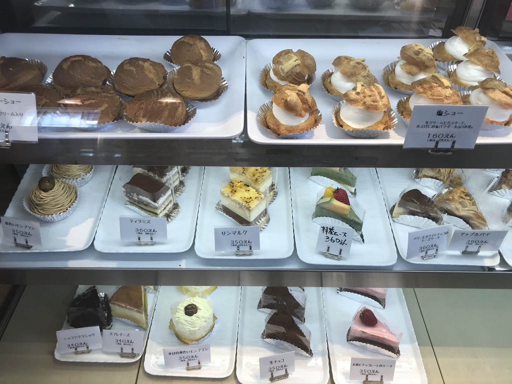 ショーケースにはずらりとケーキが並びます。写真右上の「塩シュー」は、購入後に塩パウダーをかけてくれます、生地のサクサクとクリームの甘味、そのあとにほんのり塩味。甘味を引き立て、全体の味を締めてくれる感じが病みつきになります。