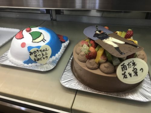 今回お目当ての品がショーケースの中にありました!立体ケーキ(コキンちゃん)と似顔絵ケーキ(高校球児)。どちらもご両親の愛情が感じられます。