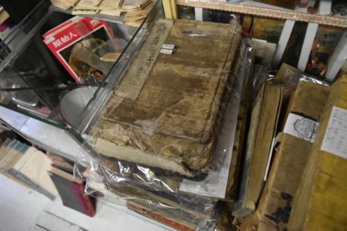 1800年代後半の江戸期の寺子屋で使われた和本が! 持ったらボロボロになるんじゃないかと思いますが、きちんと包装してあります。湿気対策もされているのか? と思う方もいるでしょうが、店内にはエアコンもあり、この日は窓を開けて換気もされていました。
