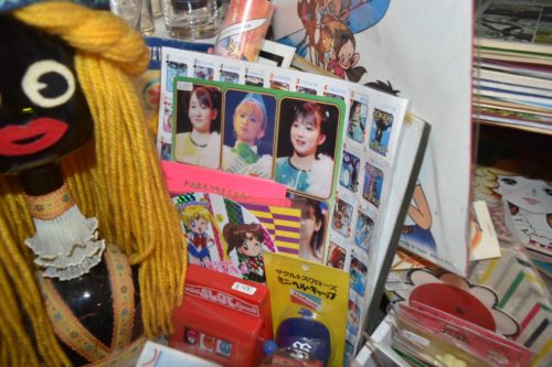 横の黒人形のインパクトがあり過ぎますが、一番新しい商品は「モーニング娘。」のカードでしょうか。恐らく2001年頃。100年以上離れている品が同じ場所にあるって不思議。