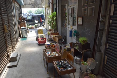 中央区河原町旧繊維問屋街の通りの一角をずっと奥に進むと、入口に何か置かれています。