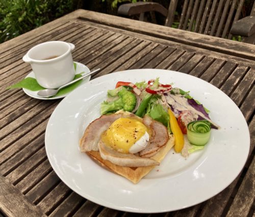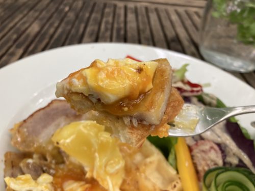 とろけた卵が、塩豚と絡み合って、ワッフルとなんさま合う!!ワッフルは甘くなく、外はサックっと中はふわっとしています。