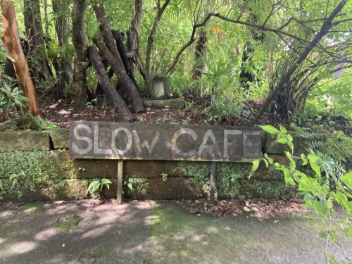 黒川温泉街に入る周辺、「あじさい通り」から細い小道を抜けた先に「CAFE OPEN」と書かれた看板があります。ここが「森の時間」の入り口です。