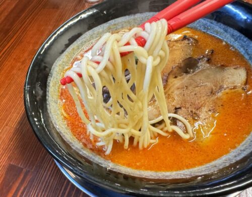 麺は細めのストレート麺で、豚骨担々麺に合う麺を探しまくって特別オーダーしているもの。