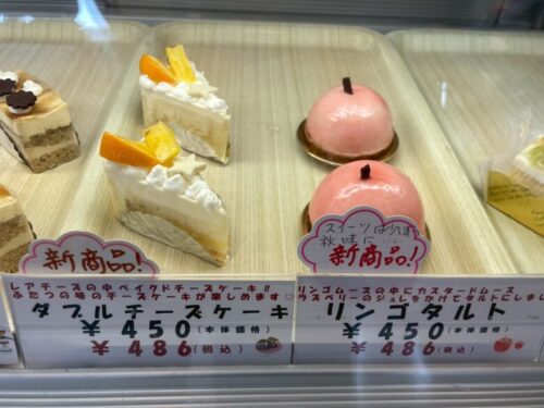 最近、ケーキも1,000円近くするものが多くなりましたが、ショーケースに並ぶケーキはどれもお手頃頃価格。