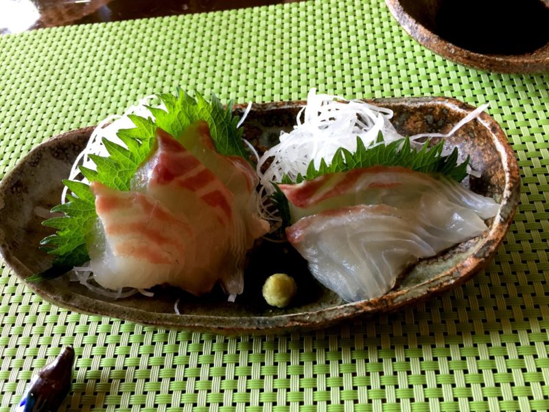 お刺身は、甘い歯ごたえのある美味しいお刺身で甘酢のあんかけは野菜とタイを揚げたもの。