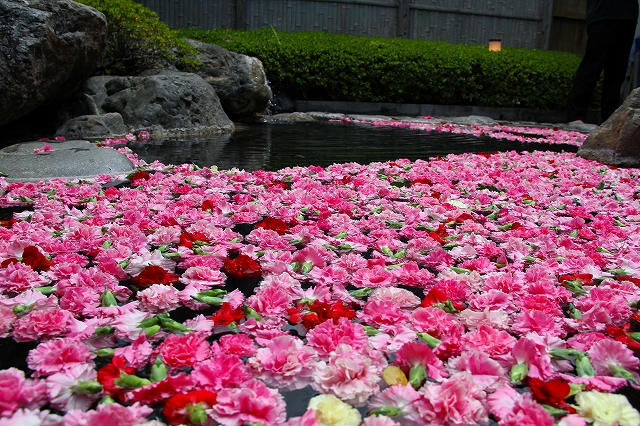 温泉にたくさんのカーネションを浮かべた「カーネション風呂」。