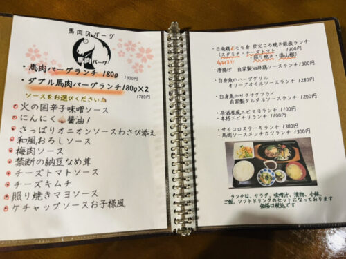 今日の私のお目当ては、ランチメニューの「馬肉バーグランチ」!!!計10種類の特製ソースの中から選べます。正直なところどのソースもかなーり美味しそうで、しばらくの間、メニューとにらめっこ状態でした!