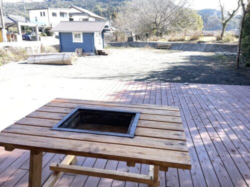 外にある青い小屋はトイレで、外で焚き火やキャンプを楽しむ人も困らないようにと設置されたものです。