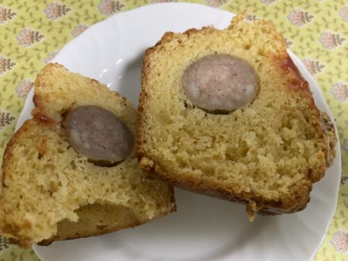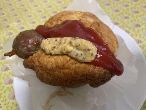 アメリカンドッグみたいな味で、甘い生地としょっぱいソーセージの組み合わせが美味しい!