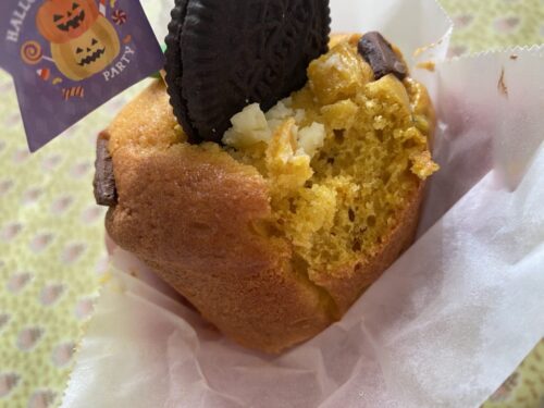ハロウィン仕様の可愛いマフィンですが、手のひらから溢れそうな大きさで、ずっ…しりと重量を感じます。