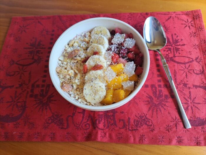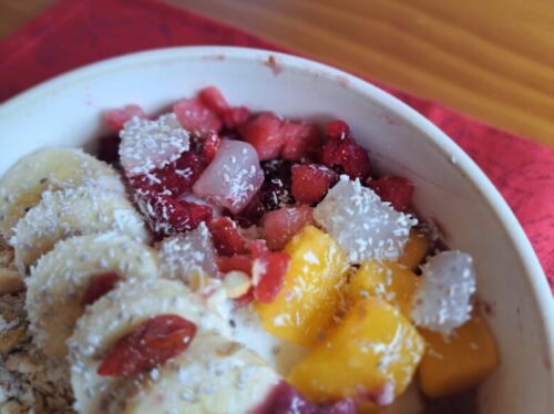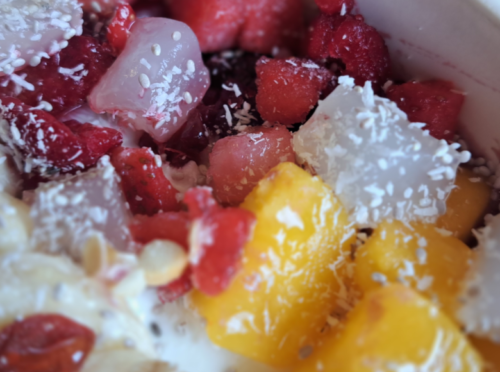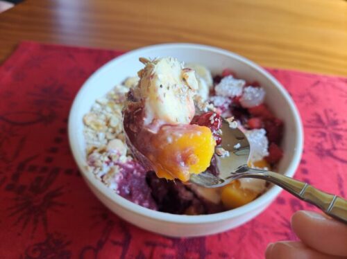 フルーツとアサイーの柔らかな食感に、オートミールの硬さ、さらにそこにわらび餅の「もちもち」がアクセントになって、今まで食べたことがないアサイーボウルです‼