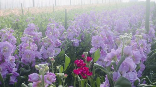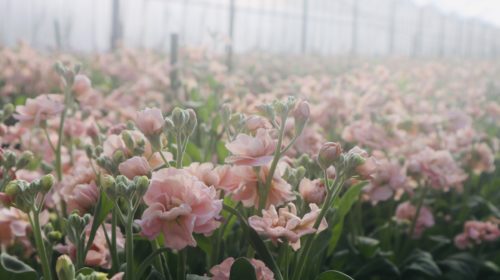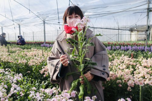臨死体験かと思う程のお花畑。ふわぁと湯気がカメラのレンズを覆います。寒暖差のせいです。美しいこのお花はストックというお花。冬季に栽培するものだそう。