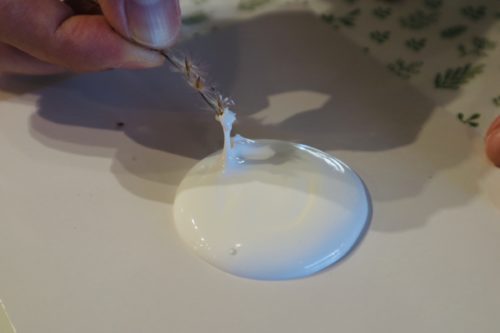 お花や葉の根元にボンドを付けて、土台となる輪に刺していきます。